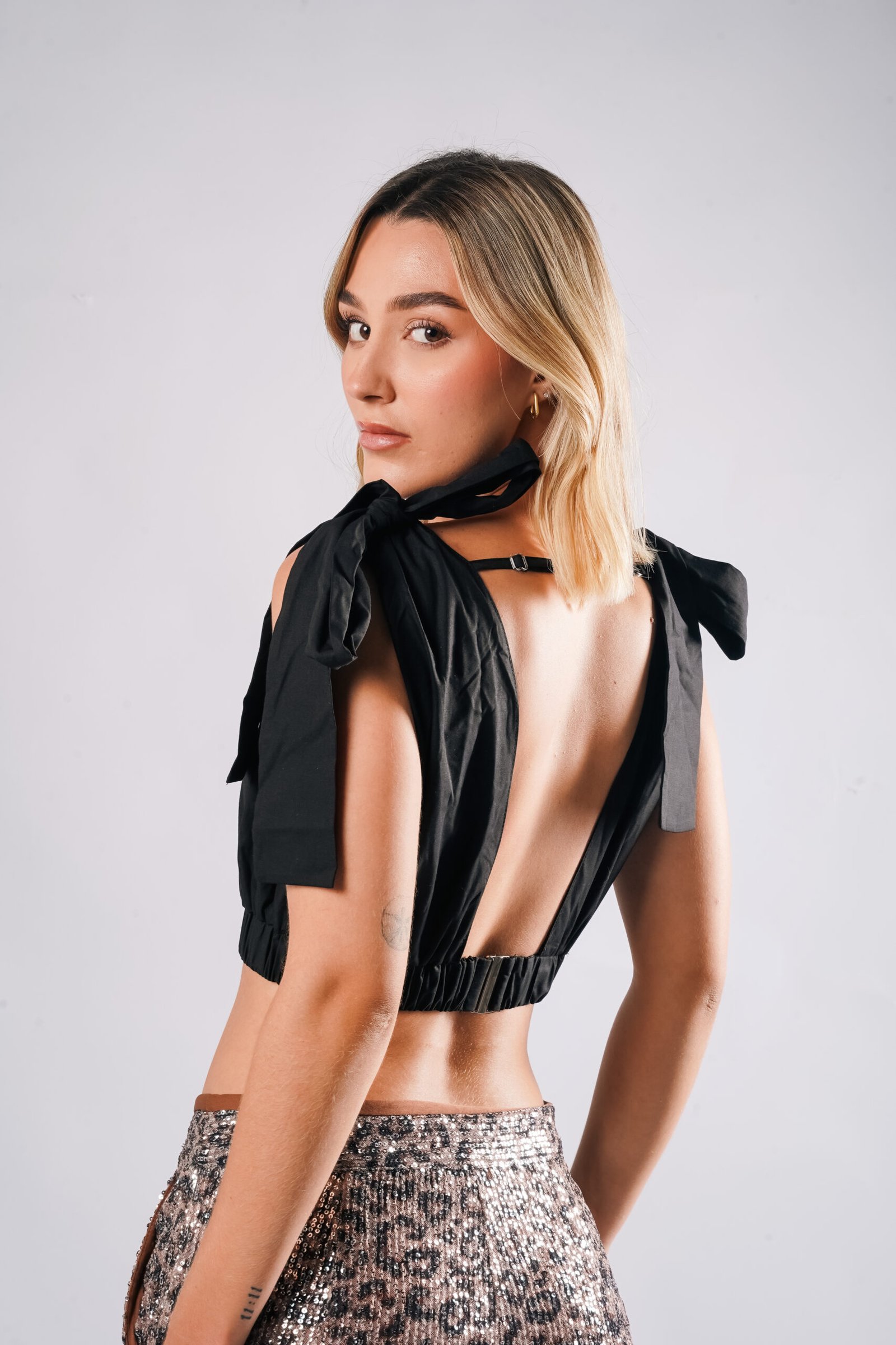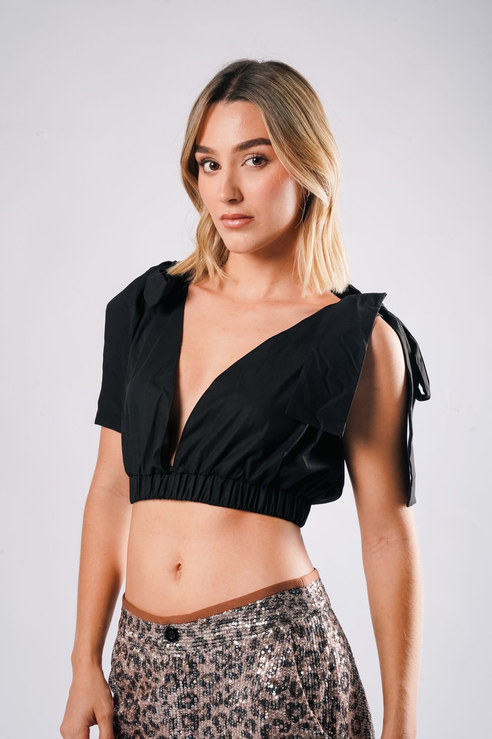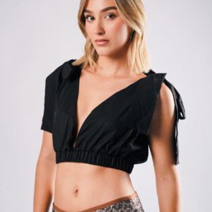 CROP TOP CONFECCIONADO EN POPELINA. CON ESCOTE EN PICO PROFUNDO. RESORTE EN CINTURA Y DETALLE DE AMARRE DE TIRAS EN LA PARTE DE LOS HOMBROS. ESCOTE RECTO EN LA PARTE POSTERIOR.