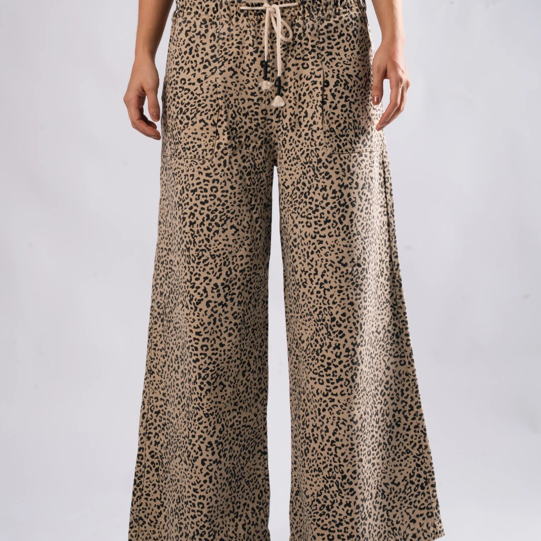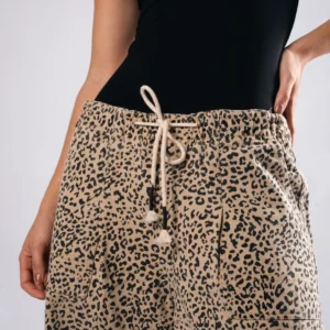 PANTALÓN EN ALGODÓN CON ESTAMPADO DE ANIMAL PRINT. PRETINA ENRESORTADA Y AMARRE CON CORDÓN. FIT AMPLIO Y CÓMODO.