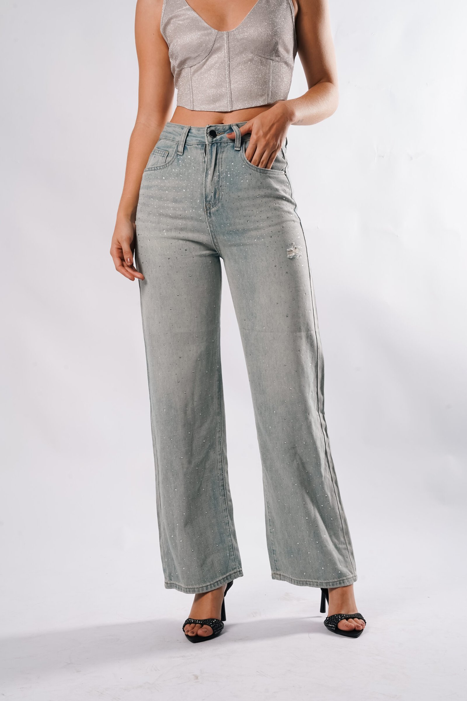 JEAN DE TIRO MEDIO. 5 BOLSILLOS. DETALLE DE APLICACIÓN DE BRILLOS POR TODO EL FRENTE DEL JEAN. EN EL POSTERIOR NO TIENE BRILLOS.