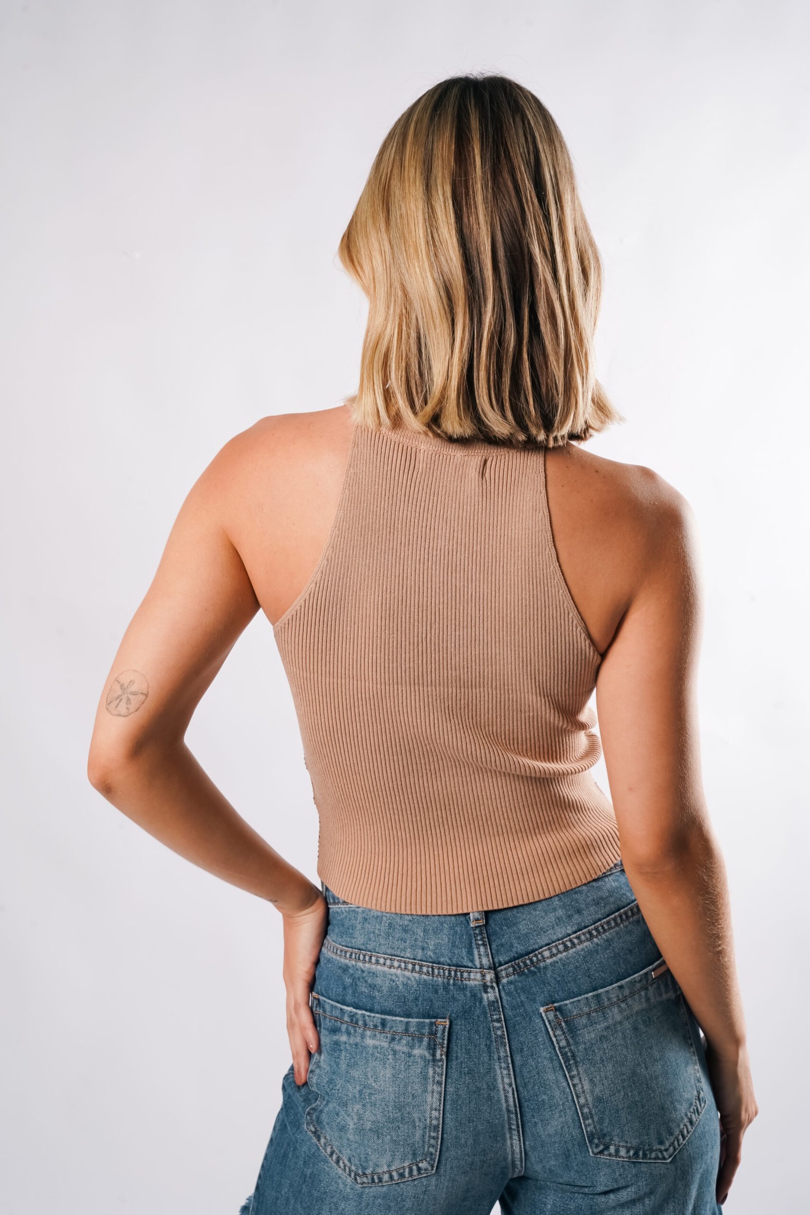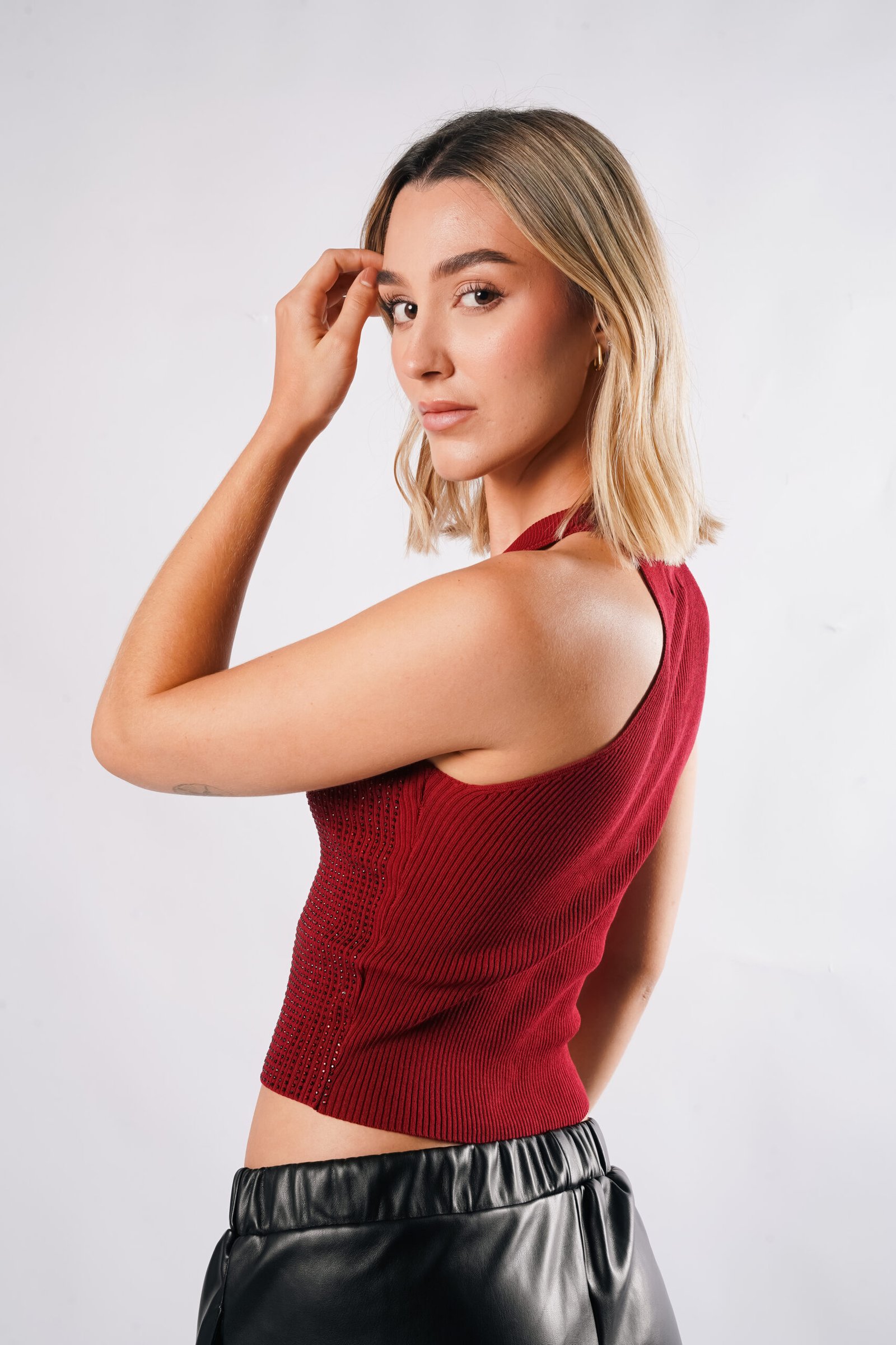 TOP DE CUELLO REDONDO CON DETALLE DE BRILLOS EN LA PARTE FRONTAL DE LA BLUSA. DISPONIBLE EN 3 COLORES BEIGE, NEGRO Y VINO